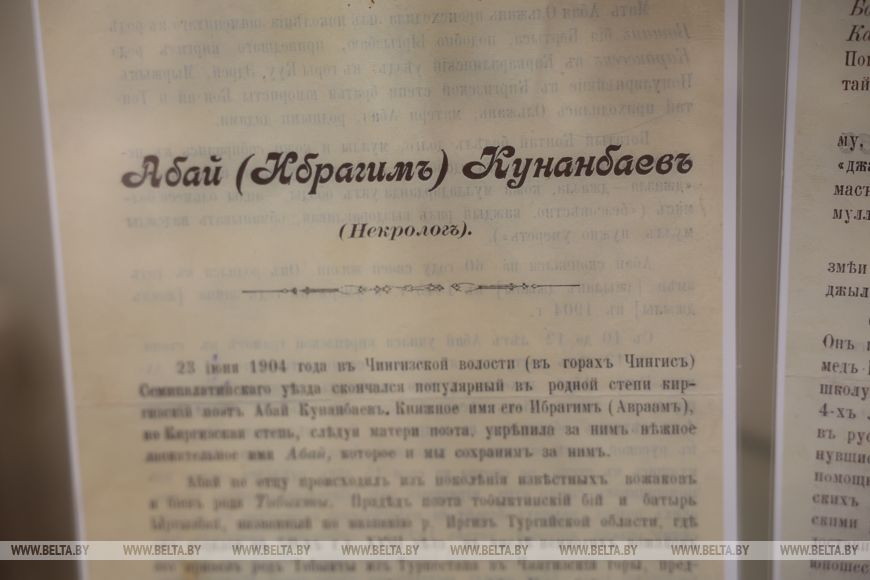 27 жніўня, Мінск /Кар. БЕЛТА/. Выставу са збору Дзяржаўнага гісторыка-культурнага і літаратурна-мемарыяльнага запаведніка-музея Абая "Жыдэбай-Барылі" (Семей, Казахстан) прадставілі ў Дзяржаўным літаратурным музеі Янкі Купалы, перадае карэспандэнт БЕЛТА.