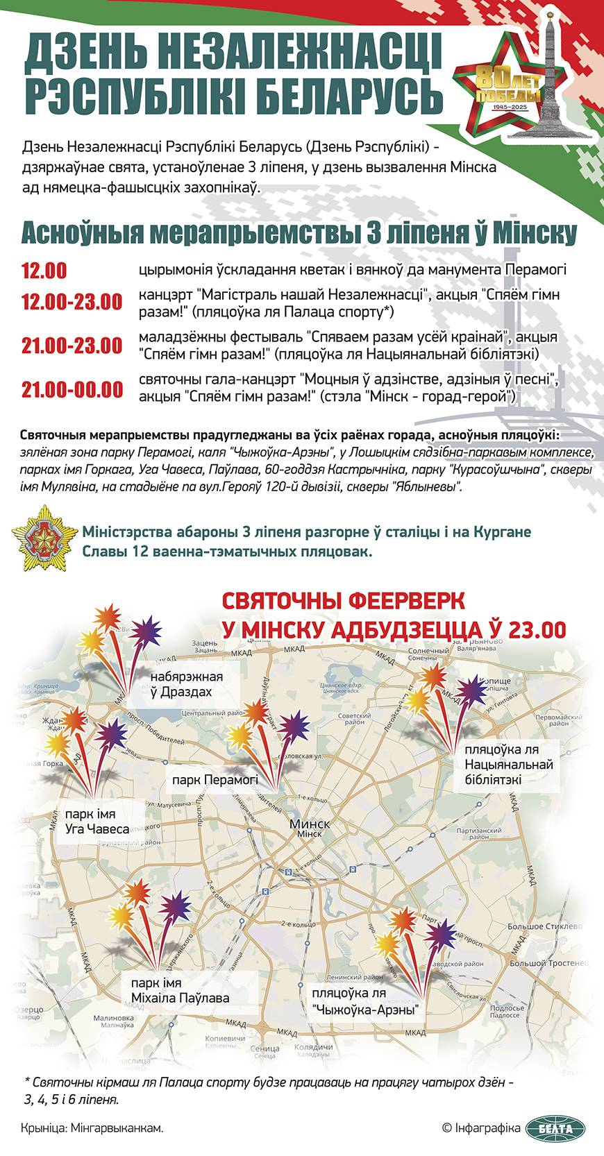 21.00-00.00 - святочны гала-канцэрт "Моцныя ў адзінстве, адзіныя ў песні", акцыя "Спяём гімн разам!" (стэла "Мінск - горад-герой").