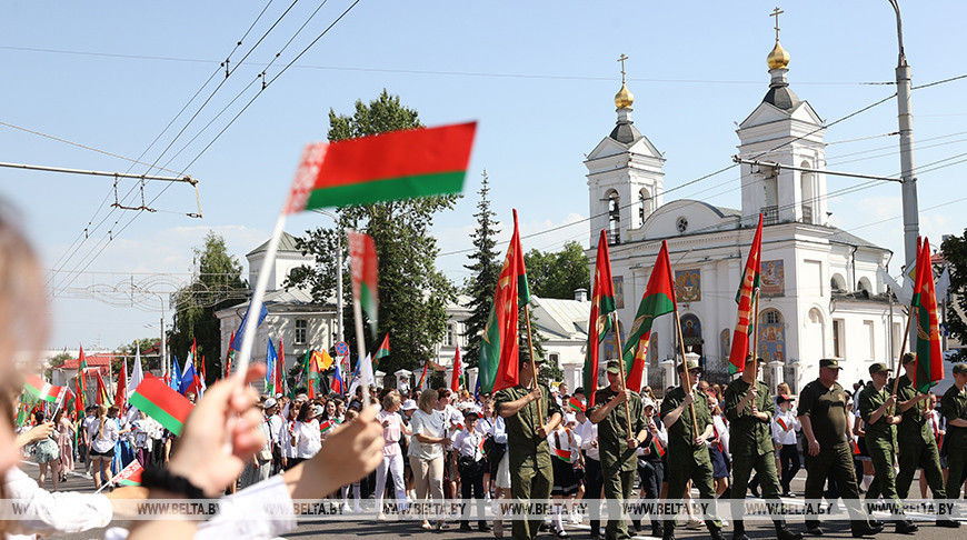 Дні моладзі стартавалі на XXXIV Міжнародным фестывалі мастацтваў "Славянскі базар у Віцебску" з патрыятычнай акцыі - шэсця "Марш пераможцаў". Каля мемарыяльнага комплексу ў гонар воінаў-вызваліцеляў, партызан і падпольшчыкаў Віцебшчыны адбылося ўрачыстае адкрыццё мерапрыемства.На здымку: у час шэсця.