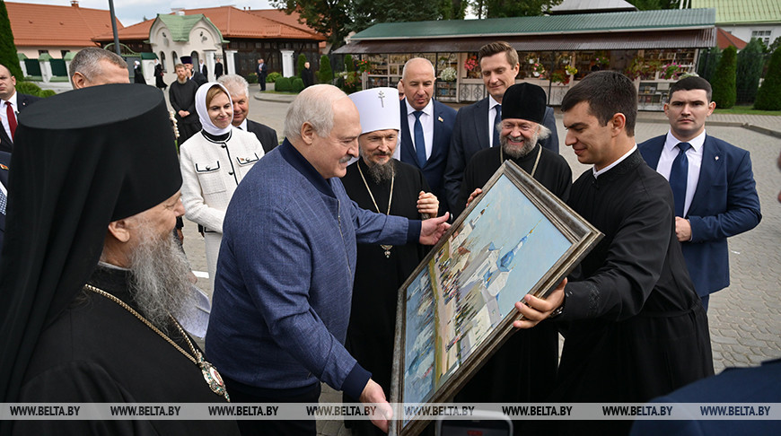 19 верасня, Жыровічы /Кар. БЕЛТА/. Прэзідэнту Беларусі Аляксандру Лукашэнку з нагоды святкавання 555-годдзя з'яўлення Жыровіцкага абраза Прасвятой Багародзіцы і 505-годдзя заснавання Свята-Успенскага Жыровіцкага мужчынскага манастыра падарылі карціну "Свята ў Жыровічах", перадае карэспандэнт БЕЛТА.