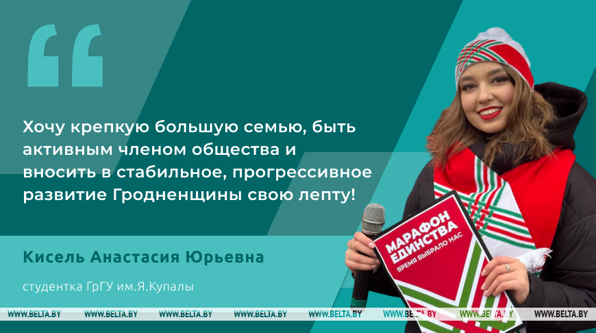 "Стараюся быць такой жа адкрытай і актыўнай, шчыра дзялюся сваімі поглядамі на жыццё з аднагодкамі, - гаворыць Настасся. - Таксама імкнуся развівацца, станавіцца лепшай, ісці да мэт. Нядаўна пачала працаваць на гарадскім тэлеканале, вяду маладзёжную праграму. І ў мяне ёсць ідэя зрабіць яшчэ адну, таксама маладзёжную, грамадска-палітычную. Каб у ёй, як і на сустрэчах у калектывах, даносіць да аўдыторыі тое, што лічу правільным, сумленным, патрыятычным. Вядома ж, хачу стварыць у будучым моцную вялікую сям'ю і спалучаць гэта з прафесійным ростам. Хачу быць актыўным членам грамадства і ўносіць у стабільнае, прагрэсіўнай развіццё краіны і Гродзеншчыны сваю лепту. Паколькі, як сказаў наш Прэзідэнт, моладзі не патрэбны цяплічныя ўмовы, мы павінны фарміравацца як адказныя грамадзяне сваёй краіны, гатовыя працаваць, спраўляцца з выклікамі, берагчы і абараняць тое, што створана".-0-