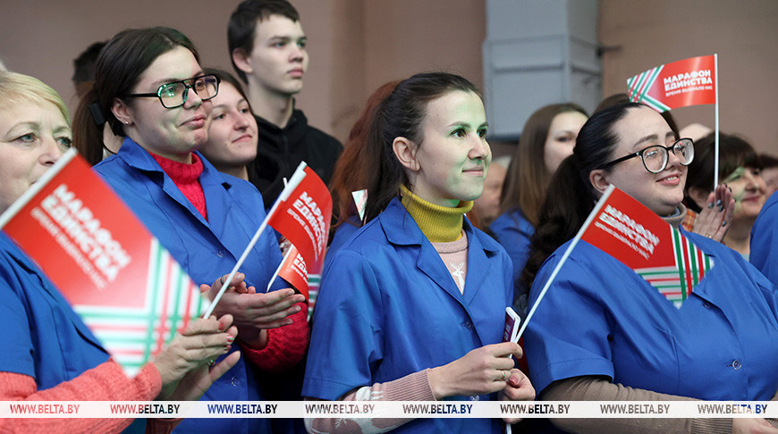 13 снежня, Баранавічы /Кар. БЕЛТА/. Праект "Разам працуем, разам спяваем!" прыйшоў у цэх ААТ "Баранавіцкае вытворчае баваўнянае аб'яднанне" Аршанскага льнокамбіната ў рамках рэспубліканскай грамадска-культурнай акцыі "Марафон адзінства". Перад супрацоўнікамі прадпрыемства выступілі вакальны ансамбль "Чысты голас", а таксама выканаўцы Аляксандра Гайдук і Улада, прадставіўшы яркія творчыя нумары, перадае карэспандэнт БЕЛТА.