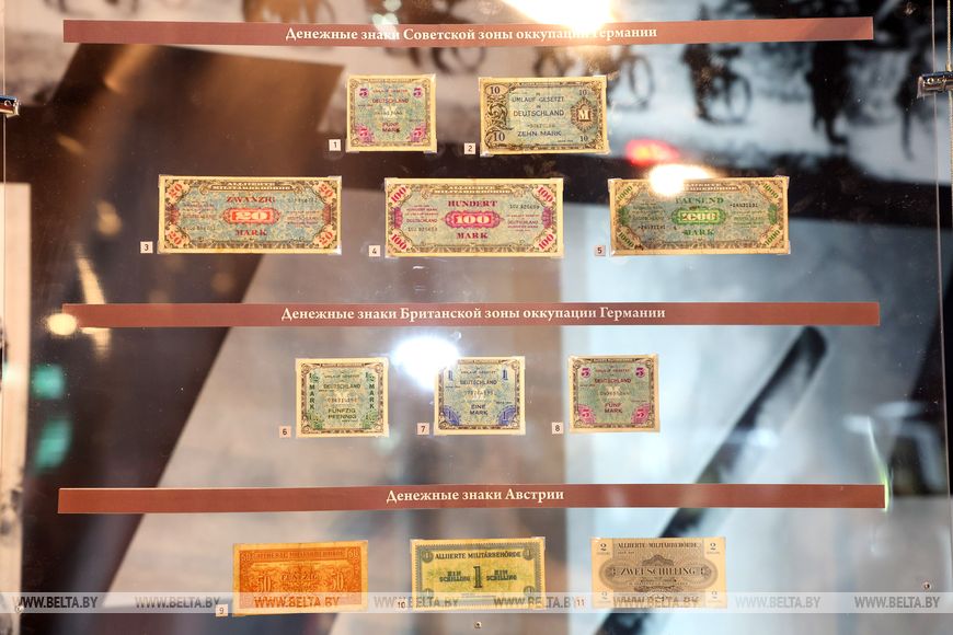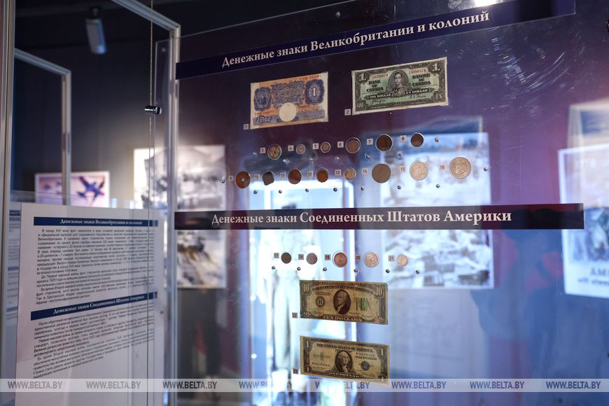 У аснове экспазіцыі - грашовыя знакі, аблігацыі, манеты краін антыгітлераўскай кааліцыі і іх саюзнікаў - Савецкага Саюза, ЗША, Вялікабрытаніі, Францыі, а таксама краін "восі" - Германіі, Японіі, Італіі.